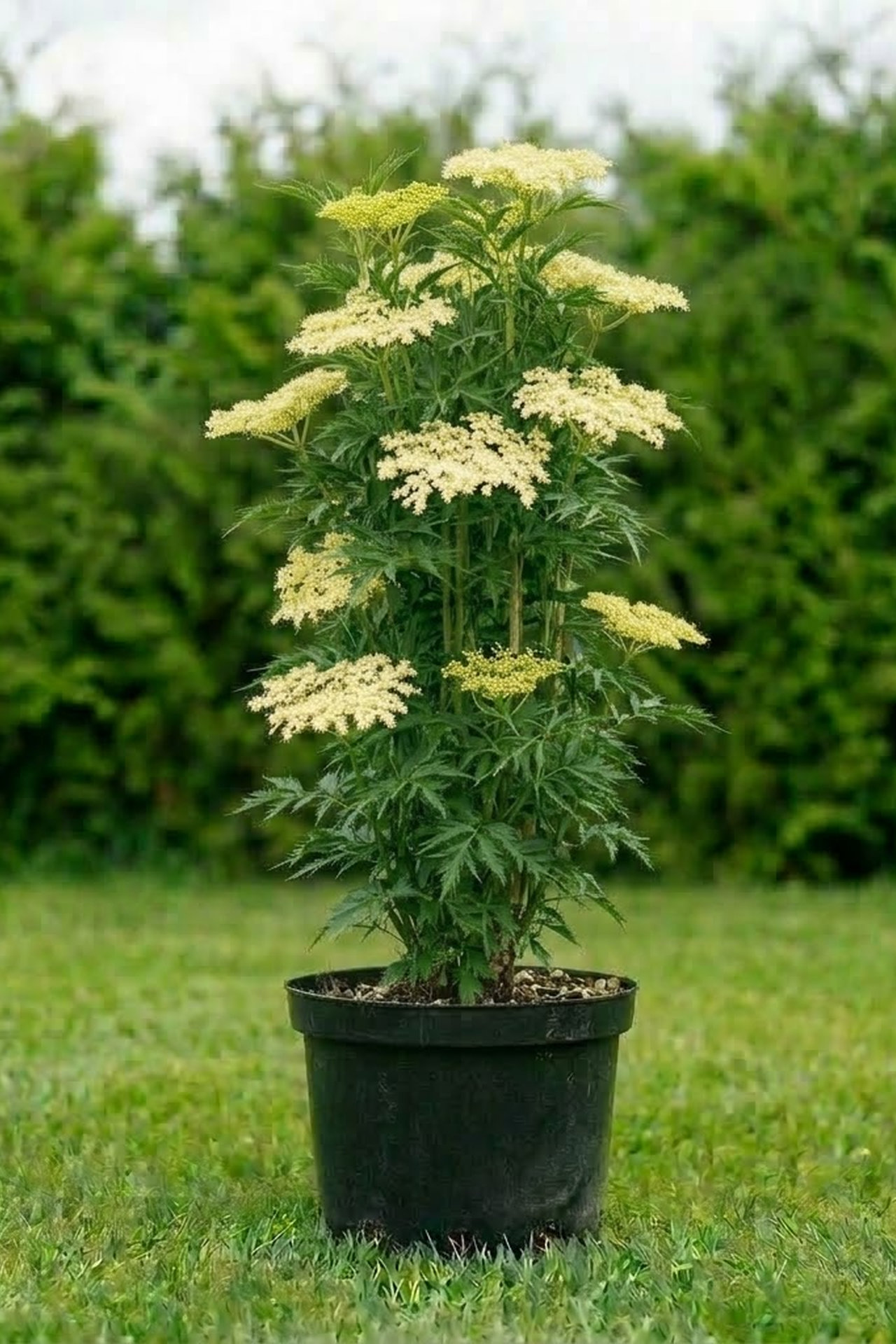 - Цветки белые, душистые, собраны в крупные плоские щитковидные соцветия. Плоды черно-фиолетовые, мелкие, съедобные